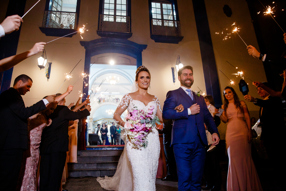 saida dos noivos e os padrinhos com iluminadores