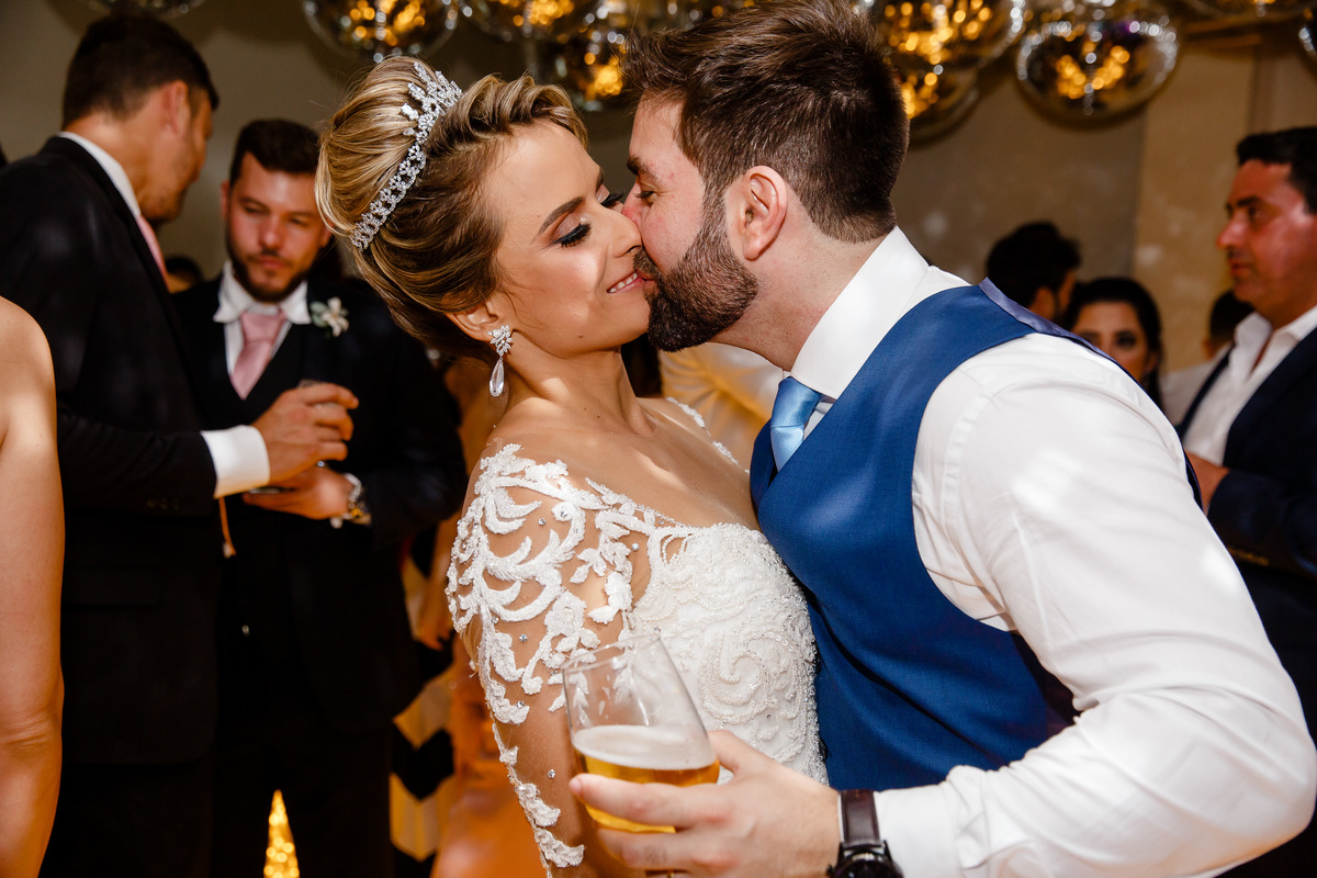noivos beijando na recepção