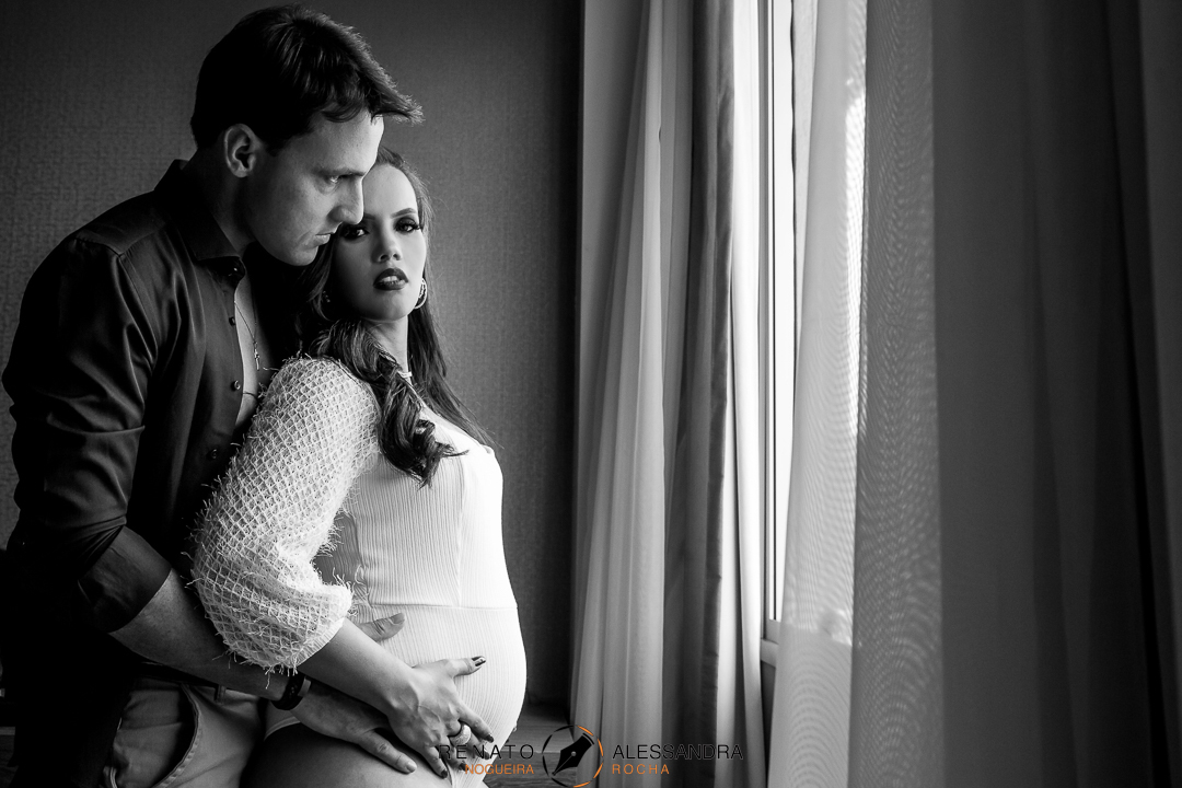"Vocês representam na minha vida, o puro amor." Fotos gestante preto e branco em quarto de hotel
